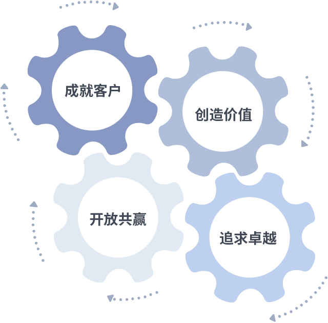 成就客户是一切决策的出发点,,,创造价值是衡量所有工作的标准,,追求卓越是我们做事做人的态度,,开放共赢是我们的格局也是最终的结果。。。价值观的齿轮环环相扣,,推动着组织里的每个人不断向前。。。。