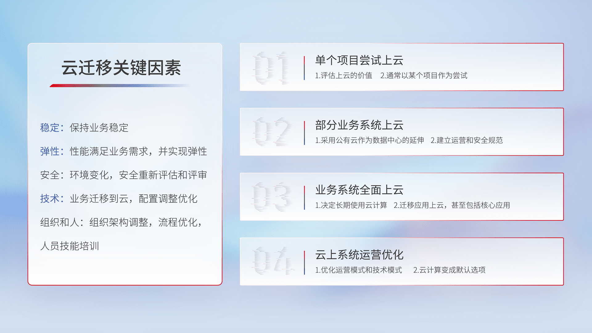 结合实际业务,,,,从规划设计、、、云平台选型、、、、云原生改造、、、、数据迁移、、、集成交付,,,,迁移全过程为客户识别最佳上云路径,,做好风险识别管理,,设计网络架构、、、、身份权限、、、、安全审计合规、、操作审计、、、、日志审计、、监控告警策略、、、、多站点容灾设计等,,对云上基础设施进行整体规划,,,提升IT治理水平,,,以满足弹性、、高可用、、、、高性能的需求。。。