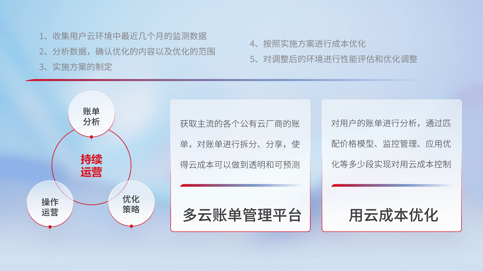 通过灵活运用多种自动化迁移工具,,,,帮助企业用户实现业务和数据高效 、、、稳定的上云迁移和云上迁移,,采用自研多云纳管平台,,以中立管理模式,,,解决多组织、、、、多云、、多运维厂商的复杂关系的管理,,,,保证多云平台资源配置的一致性,,,实时掌控云资源运行数据,,,运用智能化工具分析云资源多云平台的管理服务,,透明化管理成本支出,,,用云成本可预测、、用云费用可优化、、、云资源配额有据可依。。