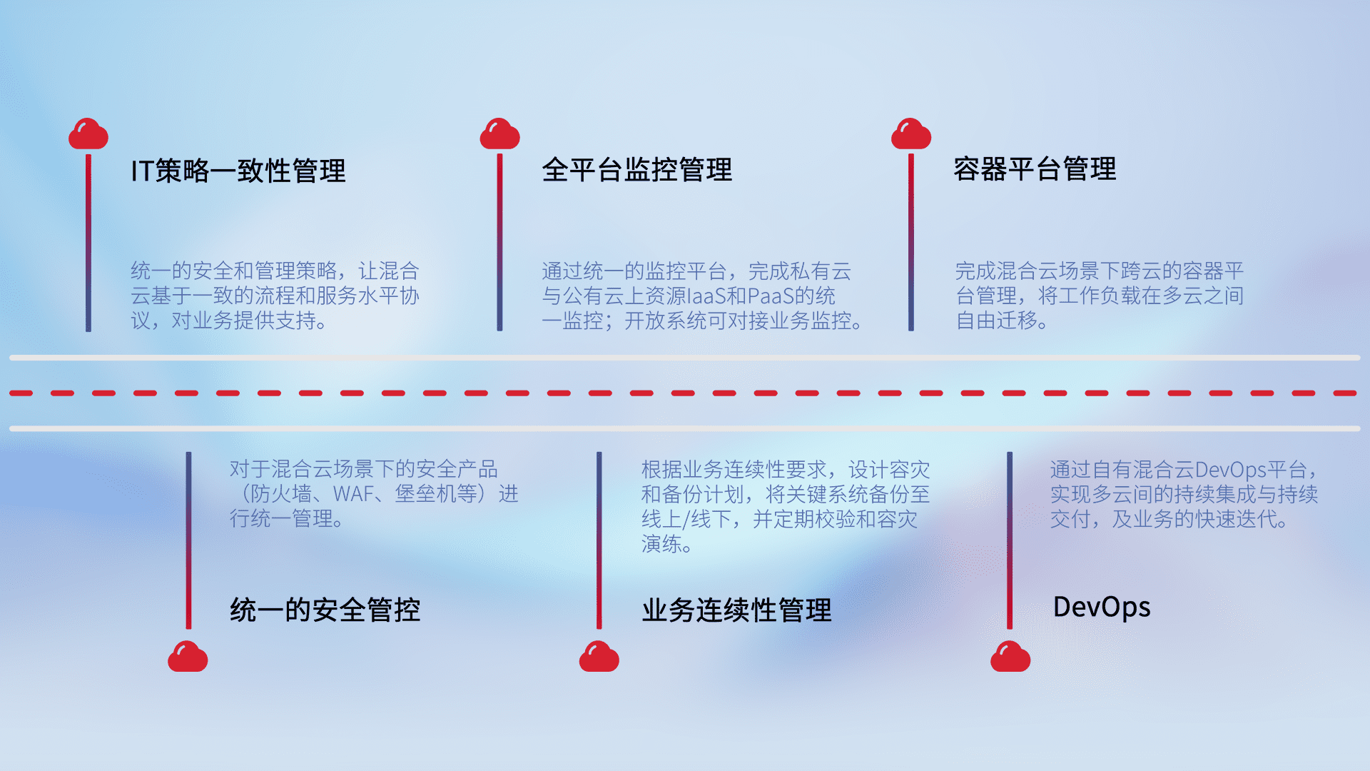 通过多云纳管,,,以统一的资源数据模型把客户的云资源进行抽象和封装,,进而实现对多云资源的统一操作,,保障云资源管理的可靠性、、、、稳定性与可用性。。。。量身定制化运维内容,,,,配置、、、、开发运维、、、、补丁管理、、备份、、监控、、、认证和访问管理、、、审计和日常巡检等,,,,保障在用云过程中的可靠度,,,稳定度以及高可用率。。。。