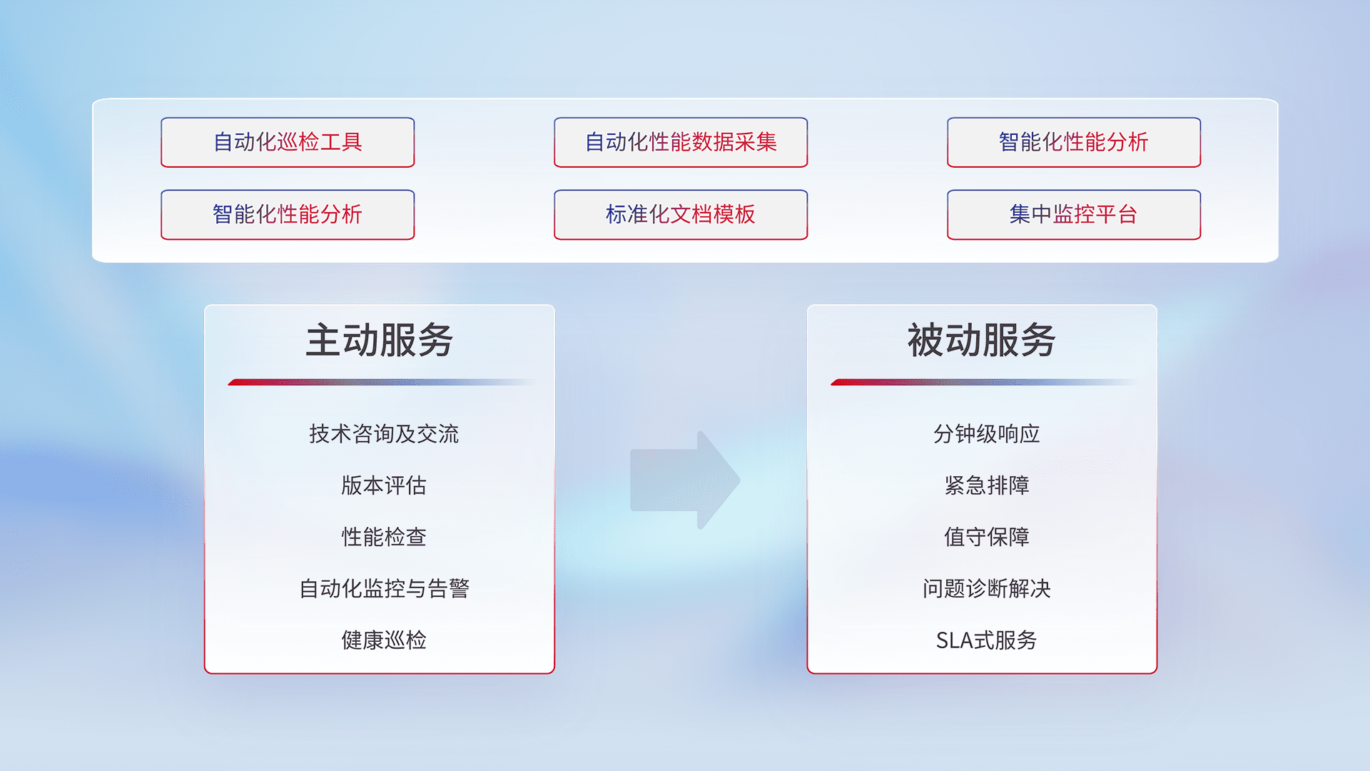 智能化工具和标准化文档,,,保障服务质量,,提供主动服务(包含技术咨询、、、、版本评估、、、、性能检查、、自动化监控与告警、、、健康巡检)和被动服务包含(分钟级响应、、、紧急排障、、值守保障、、、问题诊断解决、、SLA服务)。。。